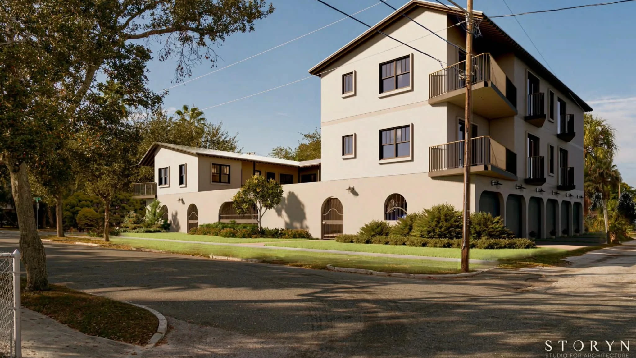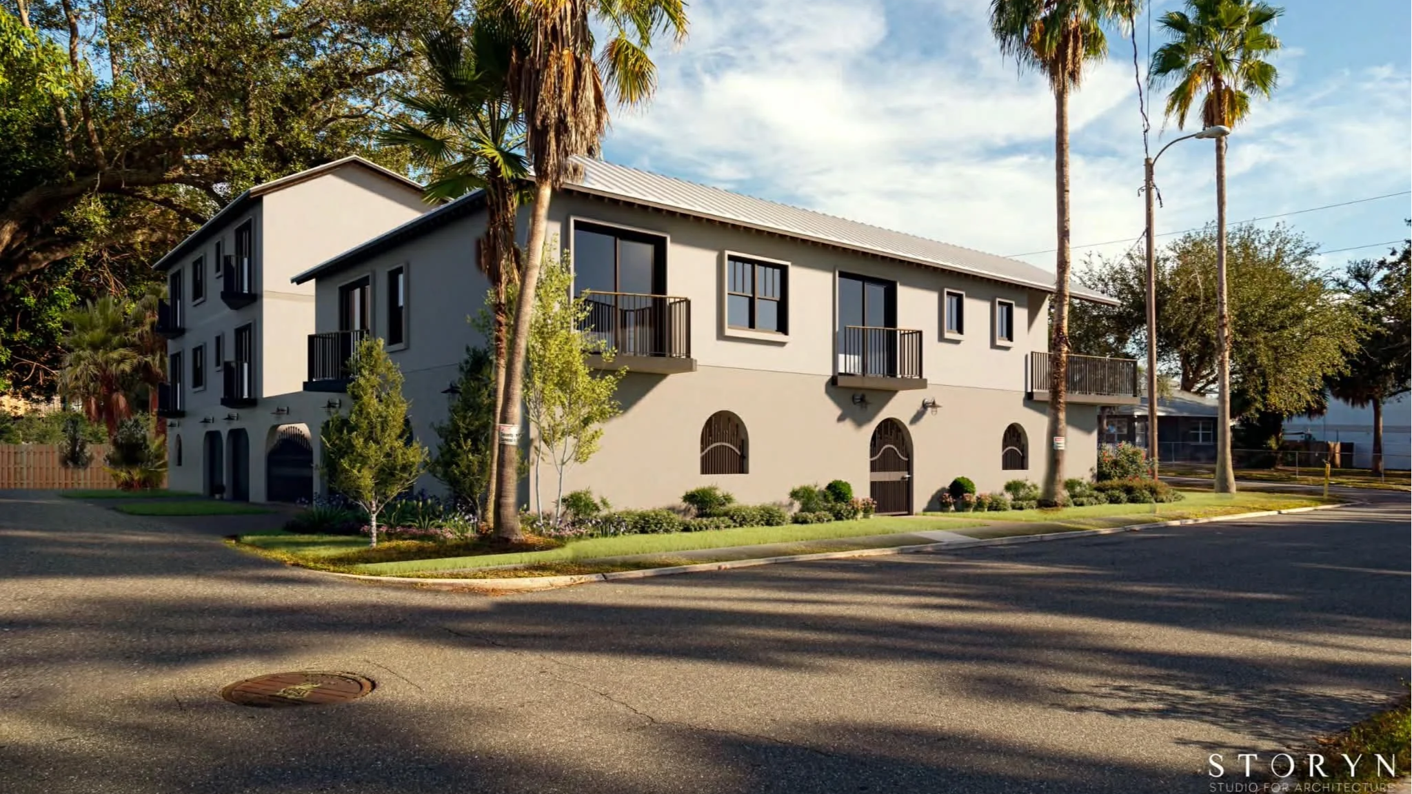 A rendering of the apartment complex and balconies facing the street | storyn studio for architecture