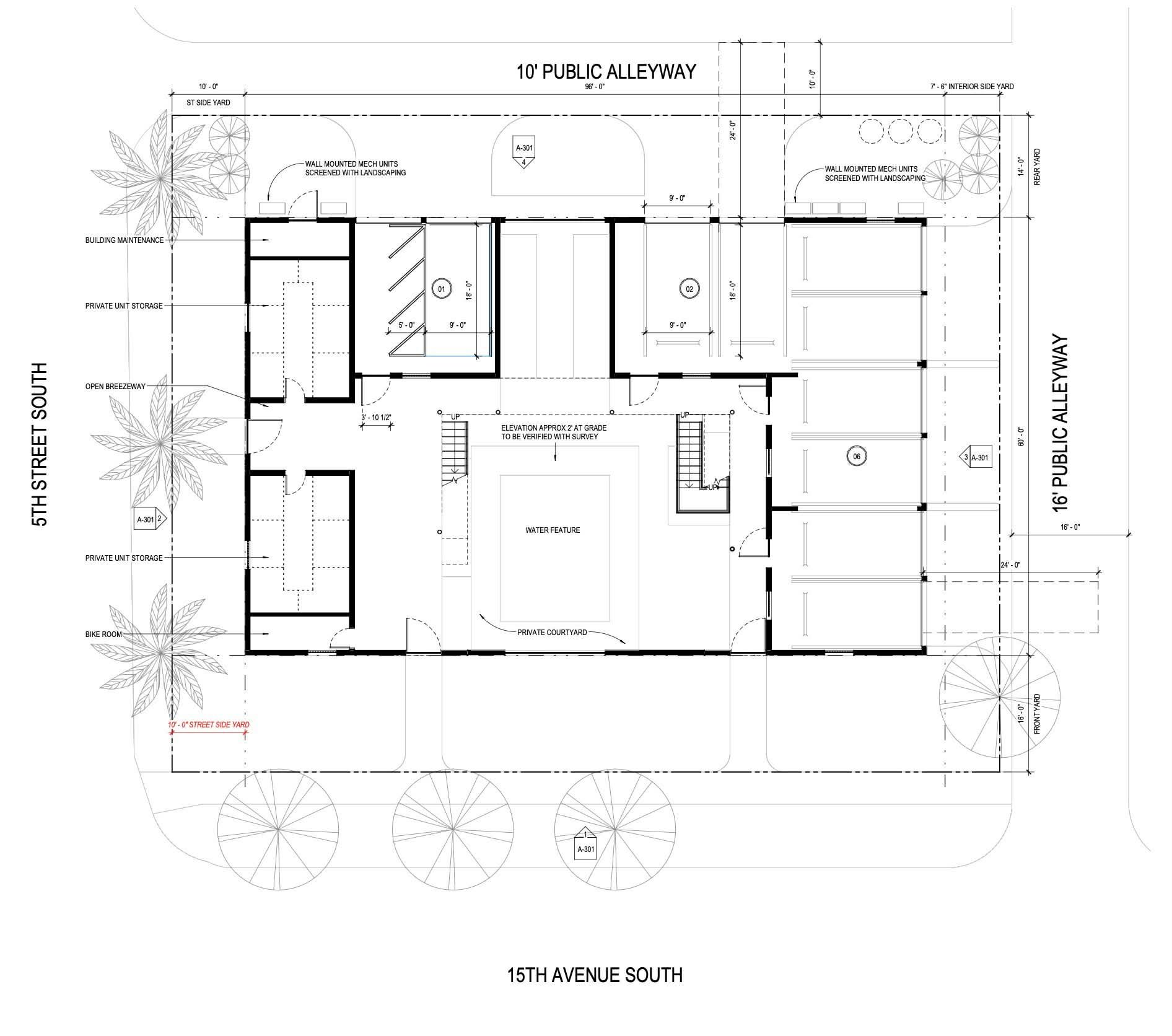 The applicant requested variances to front, side, and rear setbacks to accommodate alley-loaded parking, provide adequate spacing between the two buildings, and create the courtyard layout.