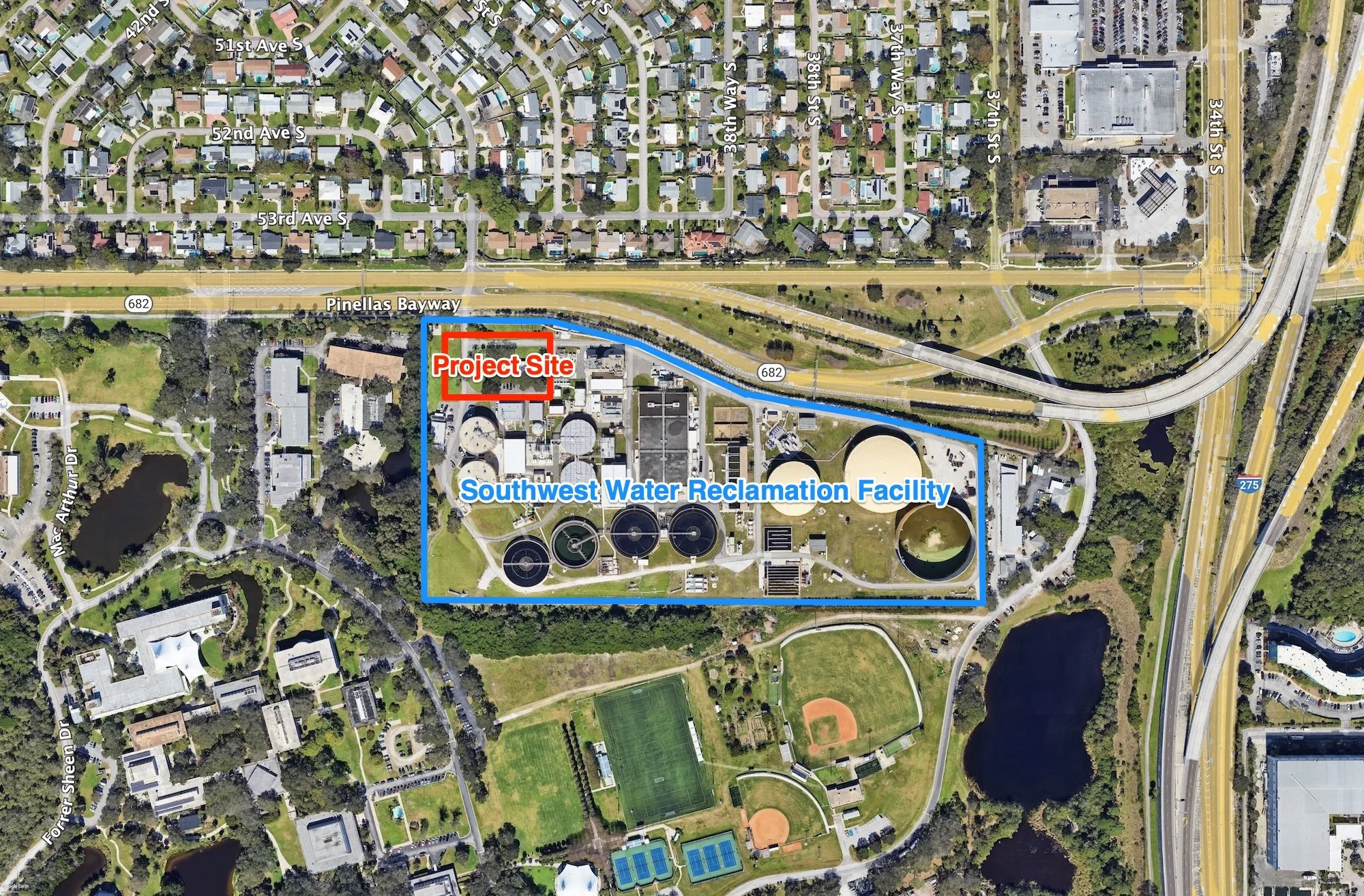 The City of ST. Pete’s Southwest Water Reclamation Facility is located at 3800 54th Avenue South next to Eckerd College | Google Maps
