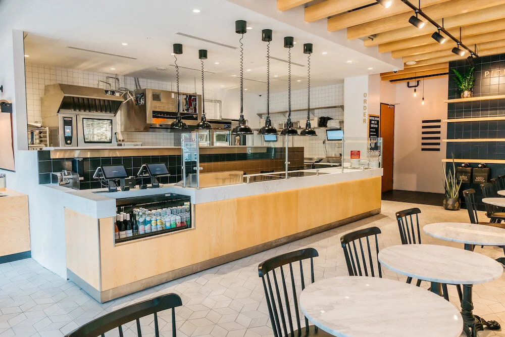 The restaurant seats 40 diners and also has patio with an additional 32 seats. The space itself is decorated with very clean black and grey features. When you enter, you’re greeted with marble tables for two on the right side of the restaurant, a walk-up counter to the left with cast-iron skillets filled with roasted vegetables, faux wood beam ceilings and a pick-up wall in the back. It’s incredible to think this space used to be a Subway just a few short months ago.