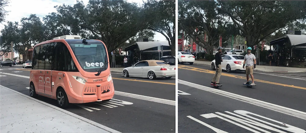Left: PSTA’s new AVA (Autonomous Vehicle Advantage) is a form of micro-transit that is being tested in downtown St. Petersburg. Right: in the past few years there has been an explosion of personal transportation devices that fall into the category of micromobility. (photos by M. Huston)