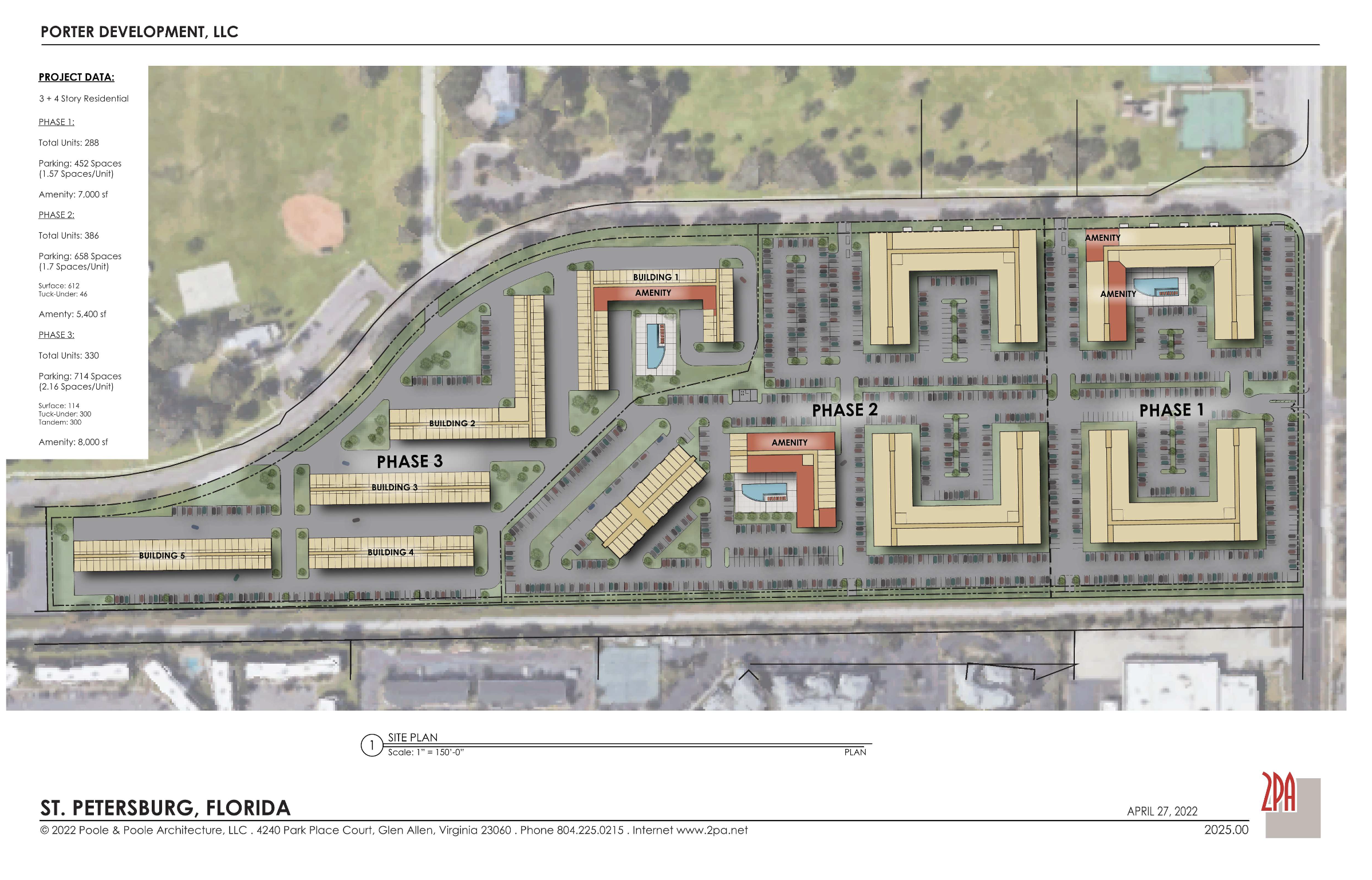 THE SITE PLAN FOR PORTER DEVELOPMENT’S NEW PROPOSAL TO BRING OVER 1,000 RESIDENTIAL UNITS TO WEST ST. PETE. 30% OF THE UNITS WILL BE SET ASIDE FOR THOSE MAKE LESS THAN 80% AND 120% OF THE AREA MEDIAN INCOME (AMI) | porter development