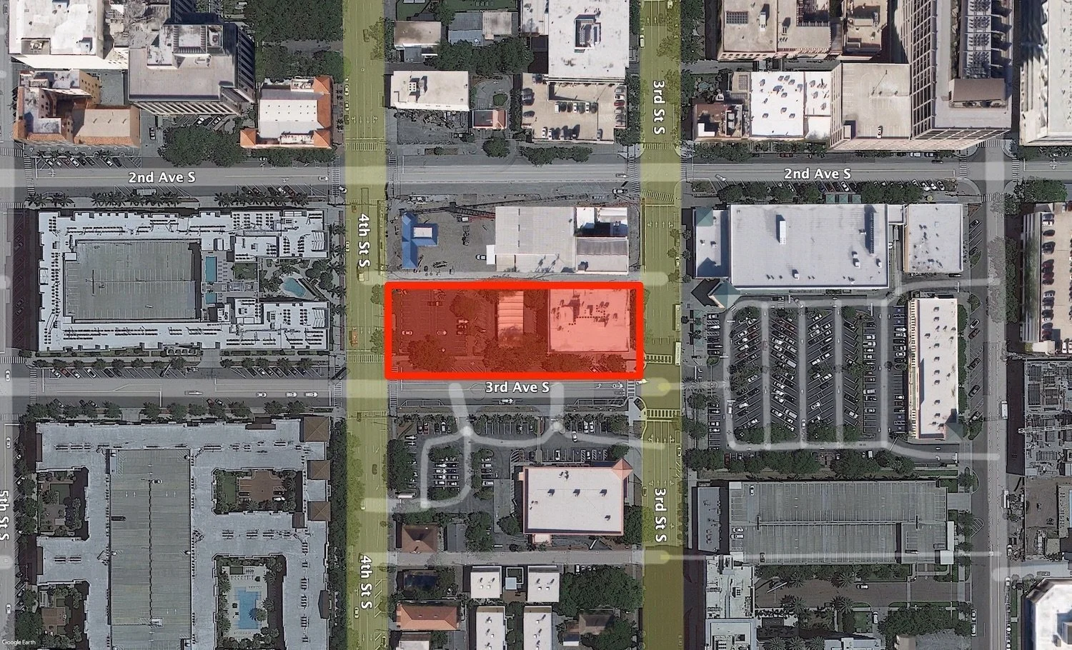 An aerial view of the 3rd & 3rd site at the northwest corner of 3rd Avenue South and 3rd Street in downtown St. Pete | google Earth