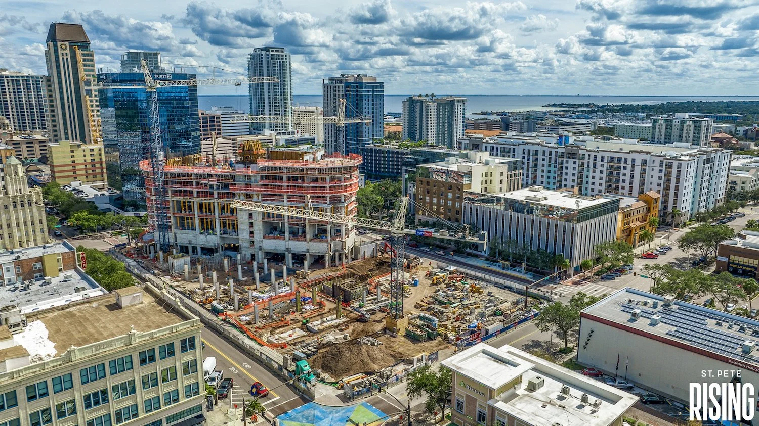 The 515-foot-tall building, which is being constructed on a full city block in downtown St. Pete, will feature 301 luxury condo units, 60,000 square feet of ground-floor retail and restaurants, 45,000 square feet of Class A office space, and 900 parking spaces. Once complete, 400 Central will be the tallest residential tower on Florida’s west coast.