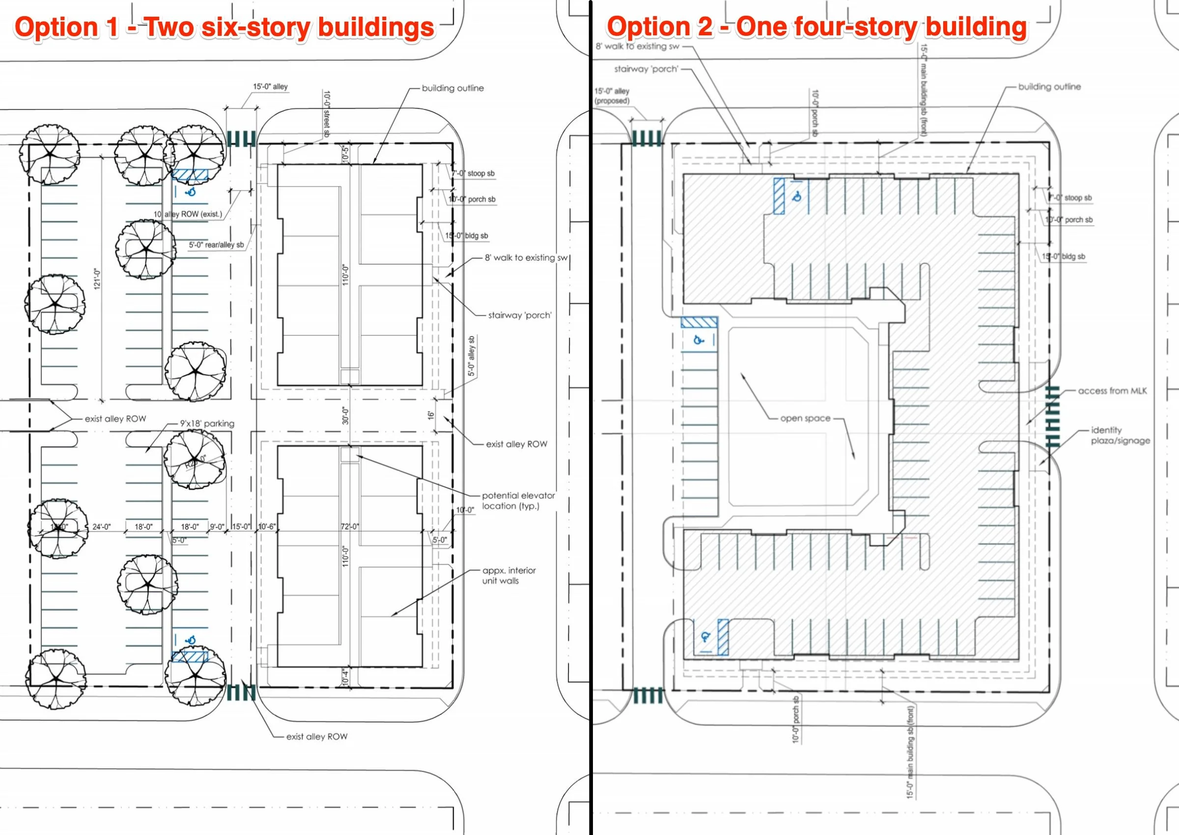 The community could be built as either two six-story buildings or, pending alley vacation, a single four-story structure with three levels of residential units over a single-story parking podium.