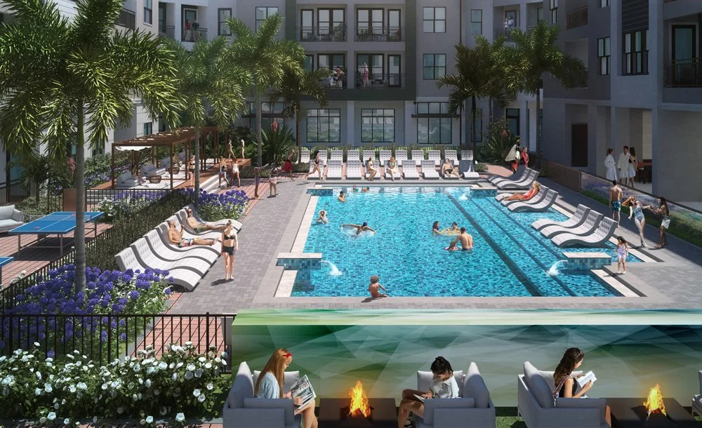 Planned amenities at Sixty90 include a clubhouse, pool with lounge areas, fitness center, pet run, and co-working space | Gravel Road Partners