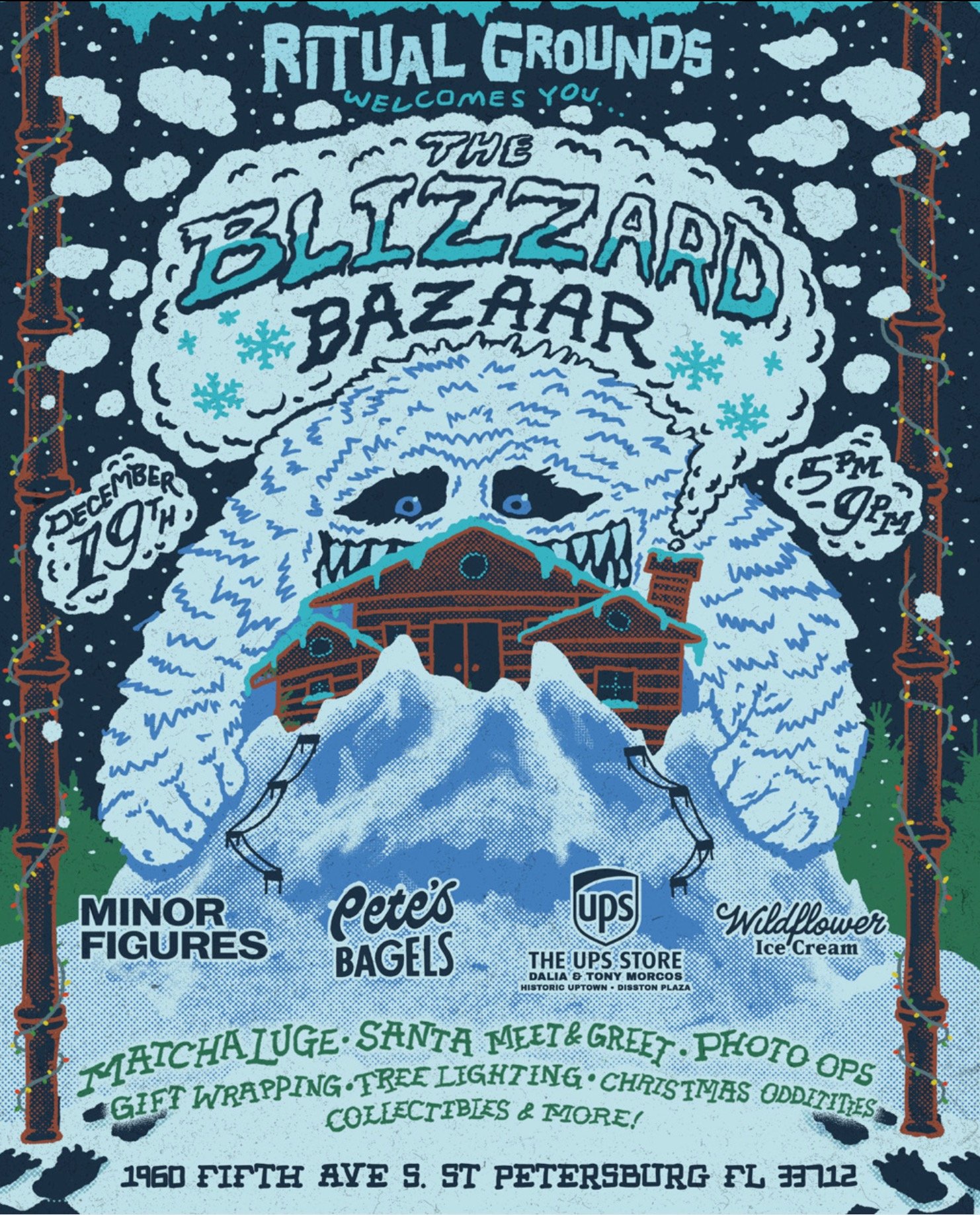 The banner for blizzard bazaar, a winter wonderland event and market taking place this friday, December 19th | ritual grounds cafe