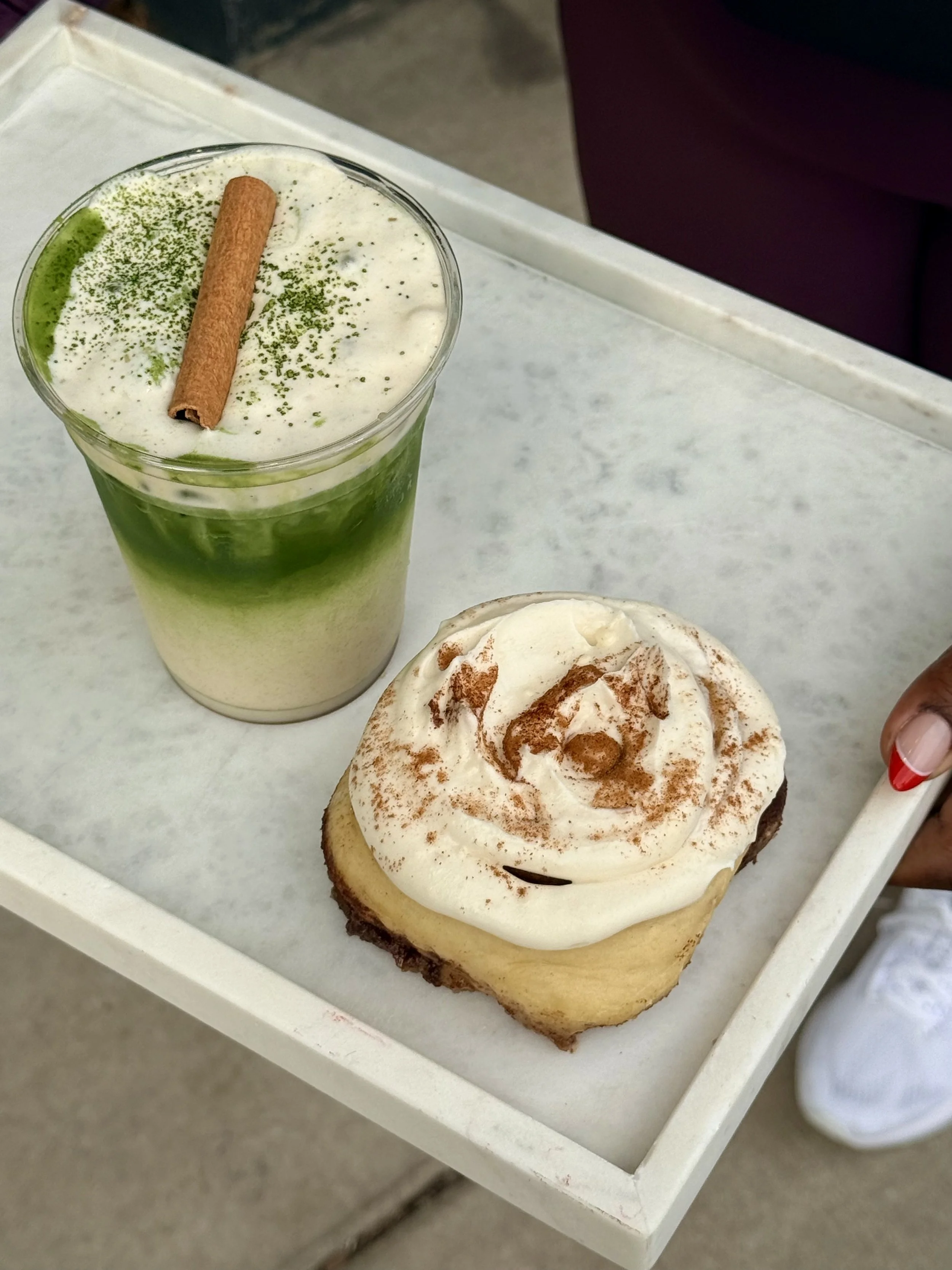 Matcha Latte and cinnamon roll from Tampa-based Flour My Day, which will be at the Blizzard Bazaar this Friday December 19th | Ritual Grounds cafe