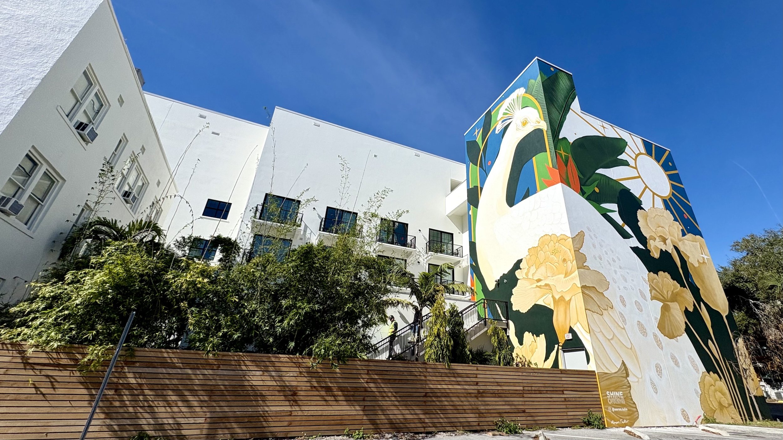 Overlooking the terrace is a five-story mural of an elegant white peacock, painted by Tampa Bay artist Aaron Tullo during last year’s SHINE Mural Festival.