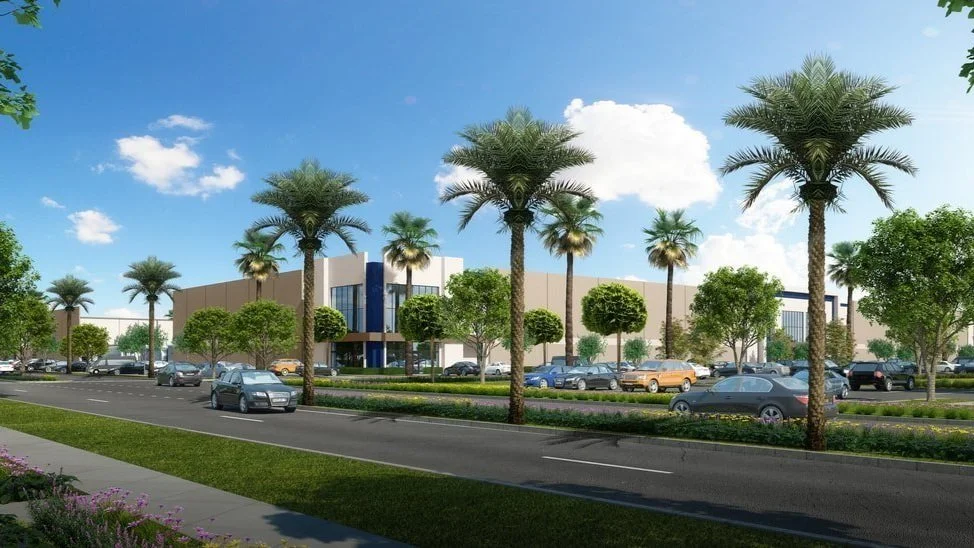a rendering of one of the new industrial buildings in the gateway logistics center | greystar/jll