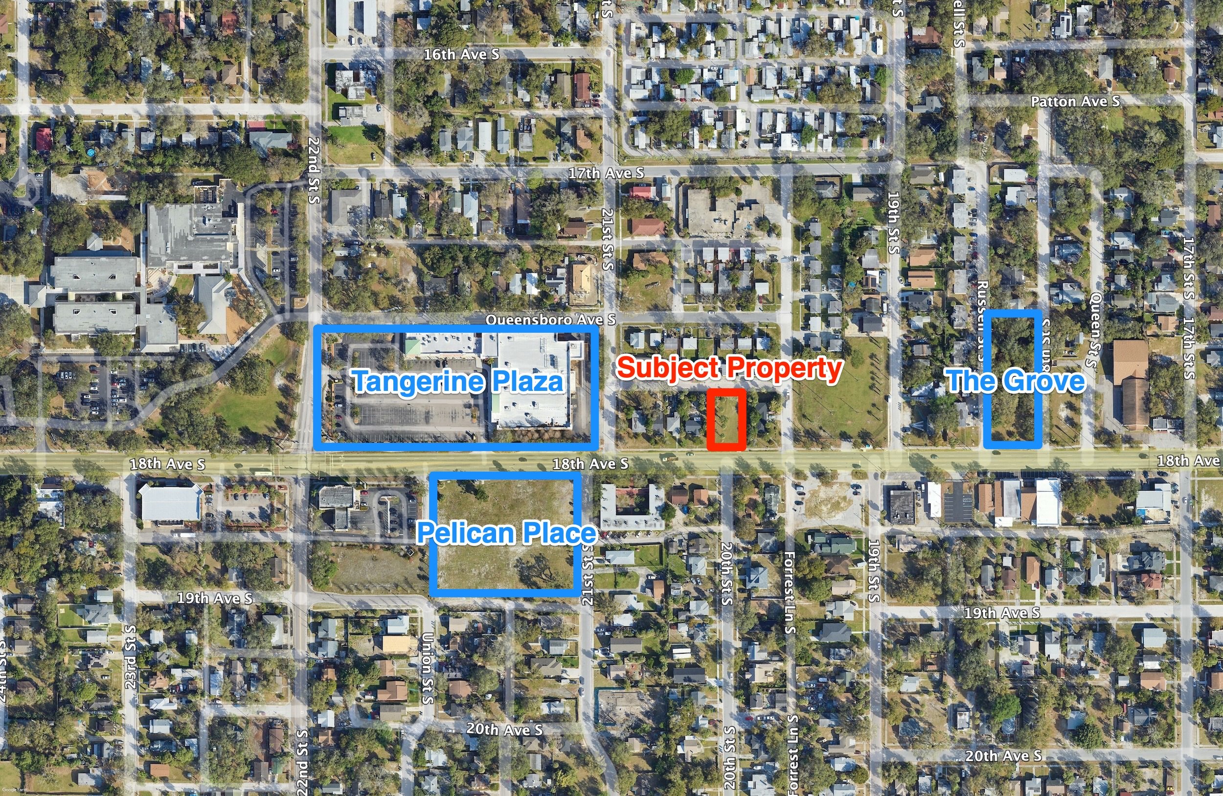 Bright Community Trust’s proposal comes as redevelopment picks up along 18th Avenue South, with The Grove Townhomes now open, Pelican Place set to add 40 townhomes, and Tangerine Plaza planned for 186 affordable apartments | Google Maps