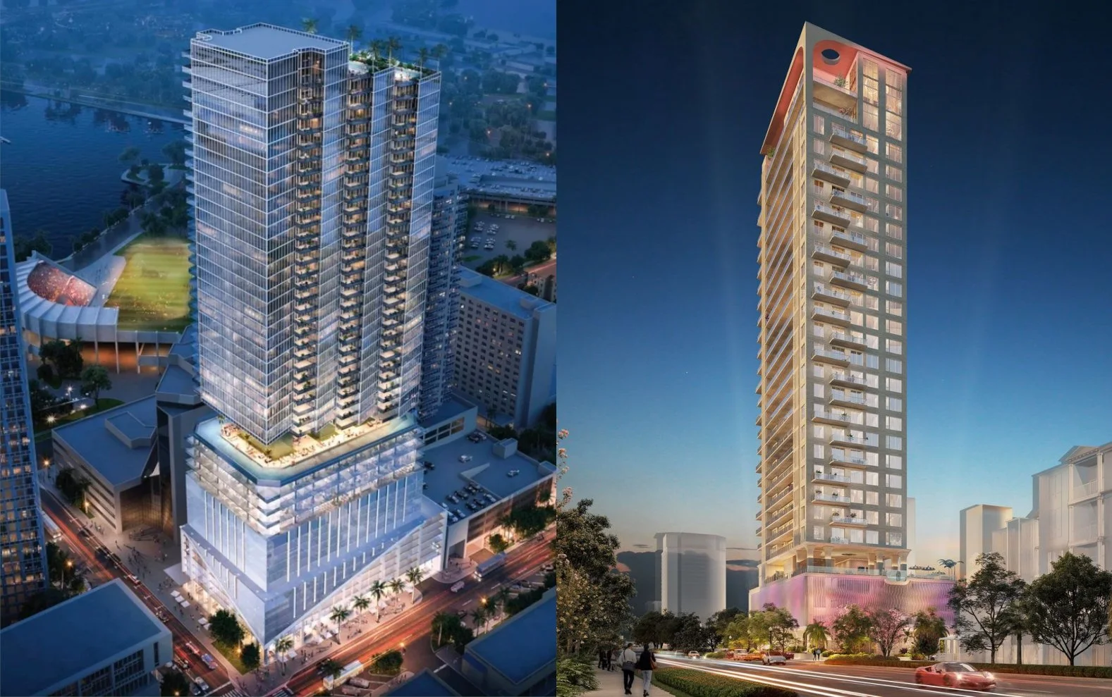 Branded residences, including the Waldorf Astoria Residences St. Petersburg (left) and the Roche Bobois St. Pete Tower (right), continue to reshape the upper tier of downtown St. Pete’s condominium market | PMG/Feldman Equities & Valor Capital