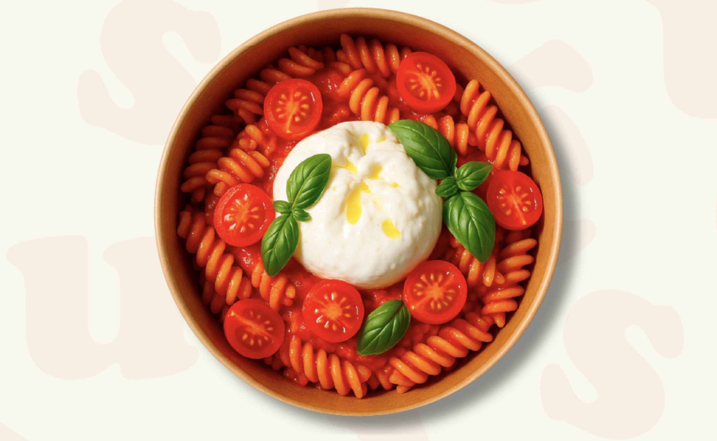 Pomodorini & Burrata, which is fusilli tossed with burrata, datterini tomato sauce, crumbled pistachio, and basil | Fusillo Italian Pasta