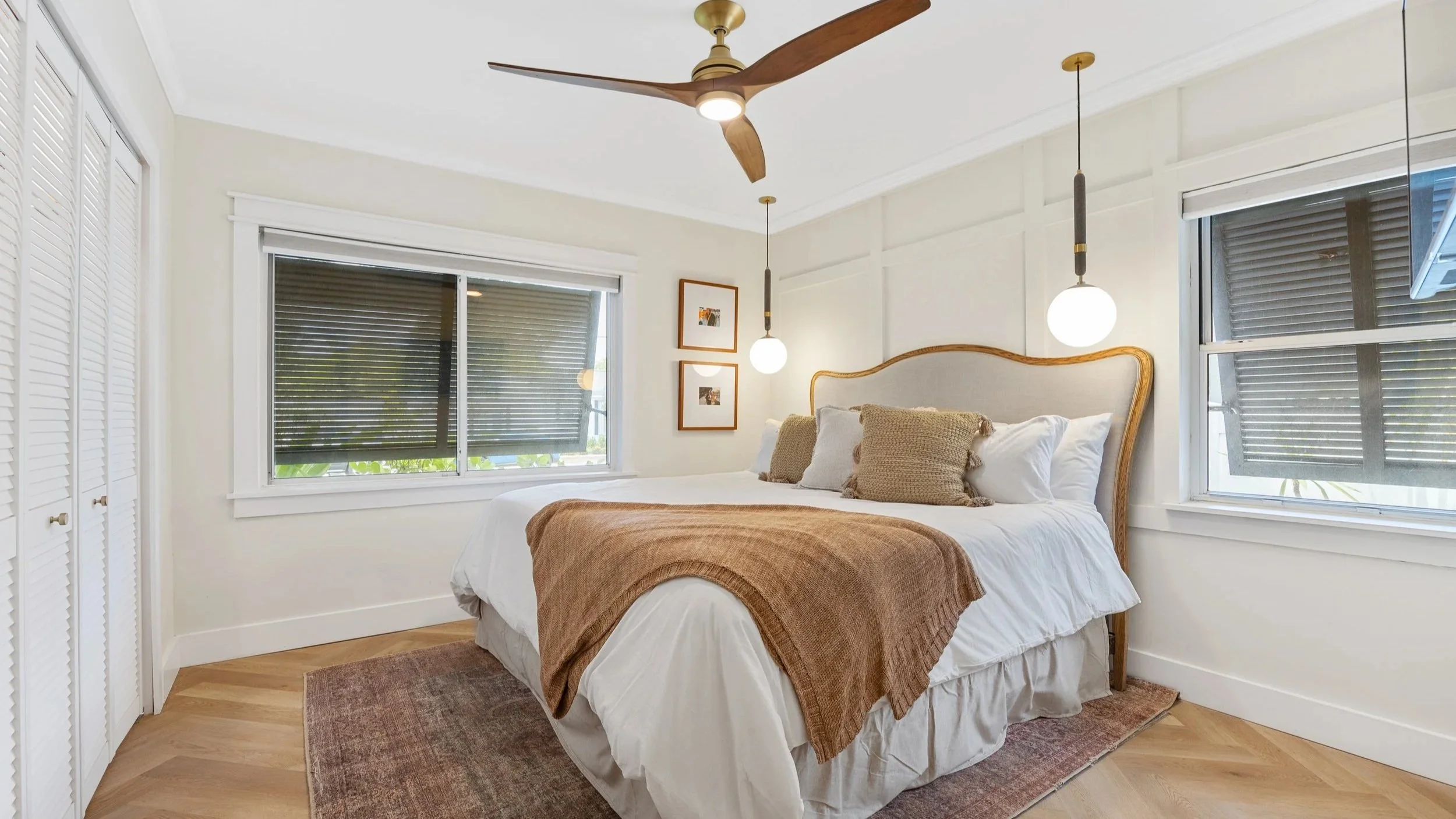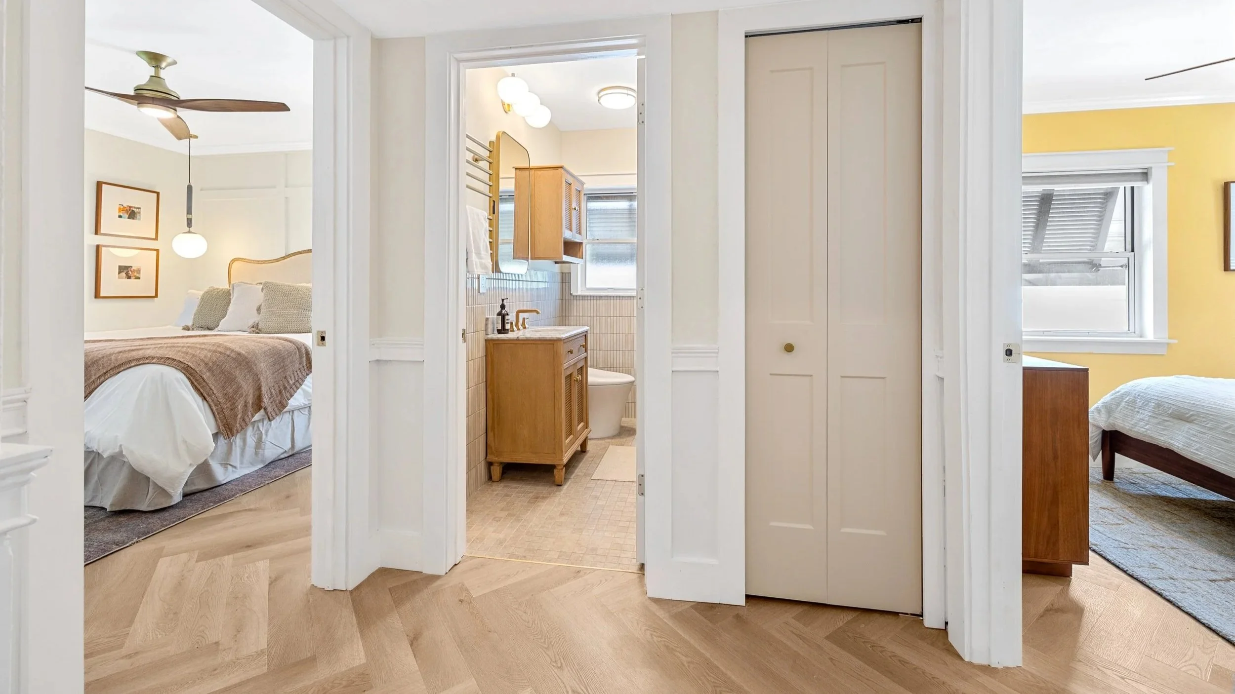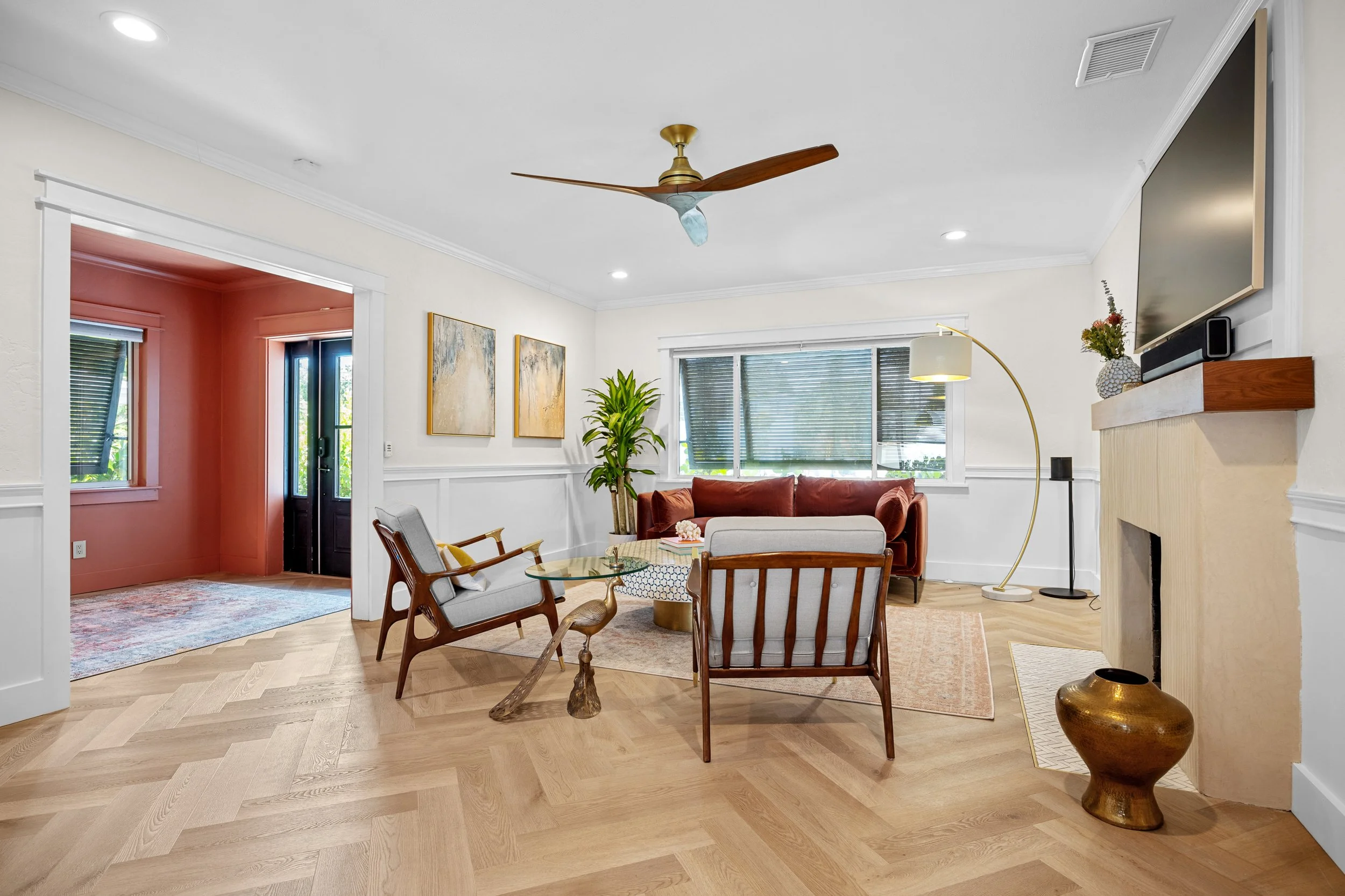 Inside, the two-bedroom, one-bath home offers herringbone-pattern luxury vinyl floors, custom trim and wainscoting, and statement lighting throughout.