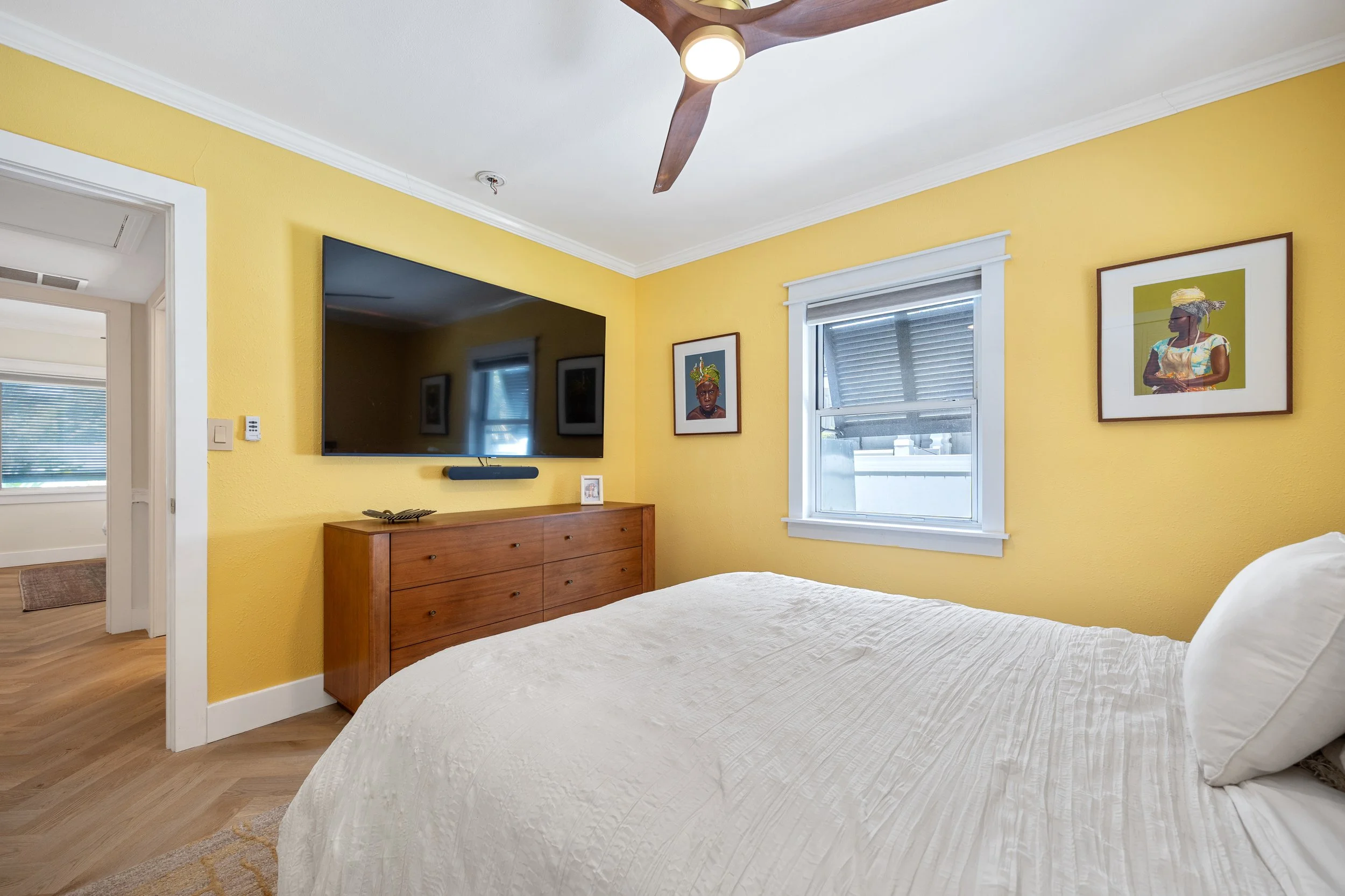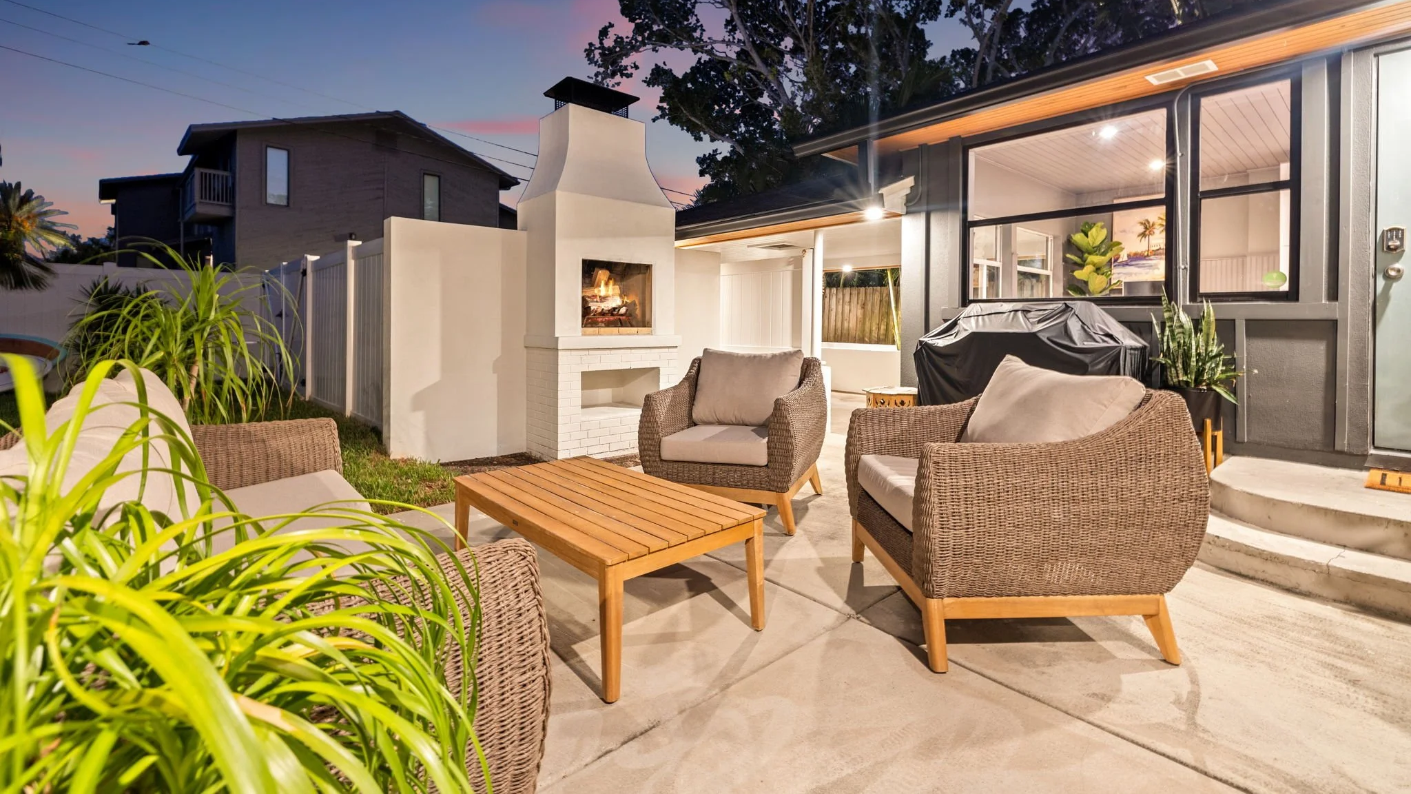 Blending Dutch West Indies design with modern upgrades, the home features artisan-crafted Bahama shutters, a distinctive architectural entryway, and a backyard wood-burning fireplace.