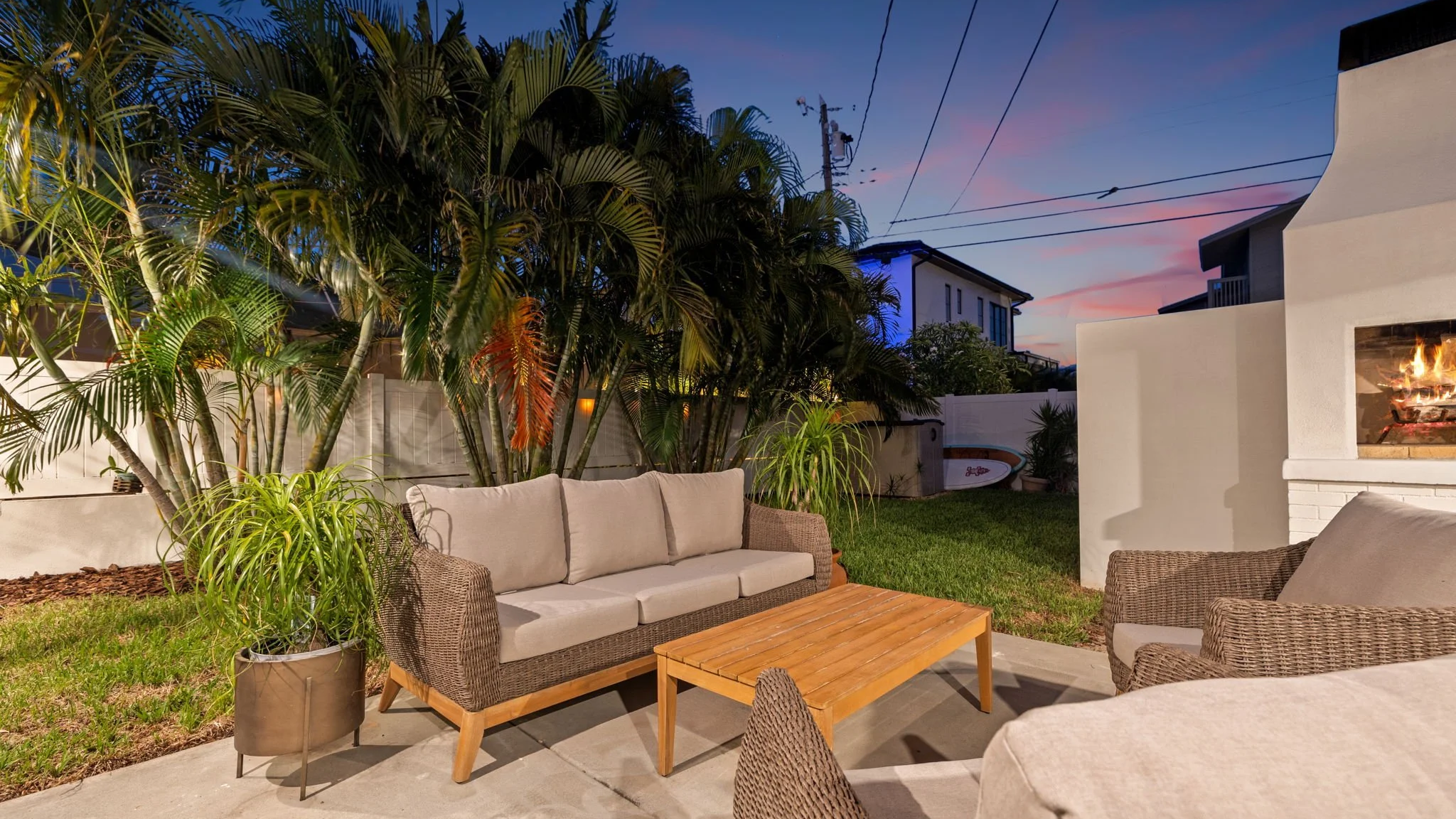 The landscaped backyard features outdoor lighting, lush landscaping, and dedicated entertainment areas.