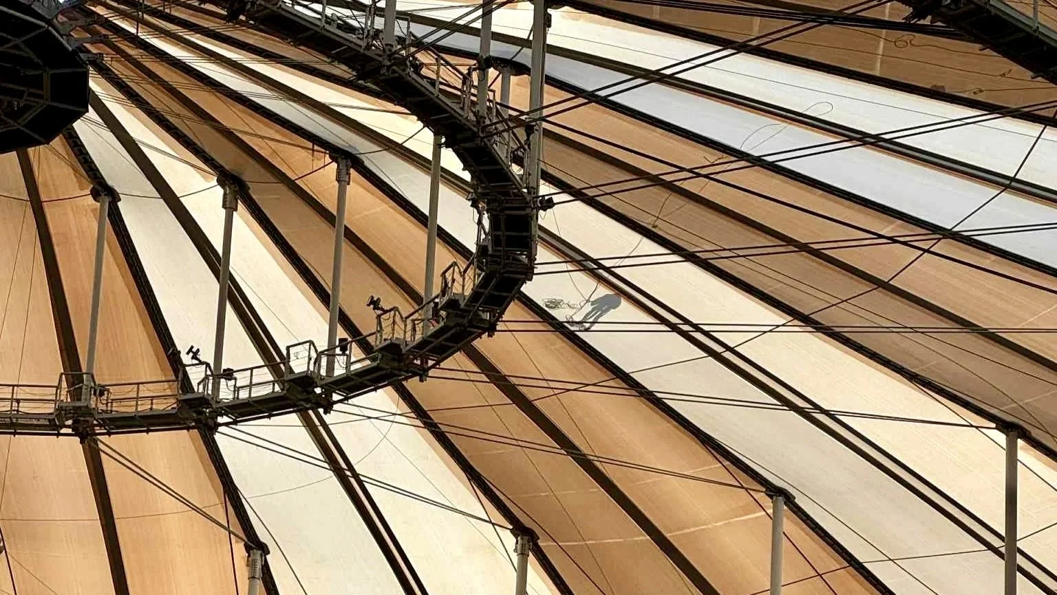 Above the concrete field and thousands of empty seats, the roof’s PTFE fabric alternates between white and orange-tan panels. City Architect Raul Quintana noted the color variation will fade out by spring.