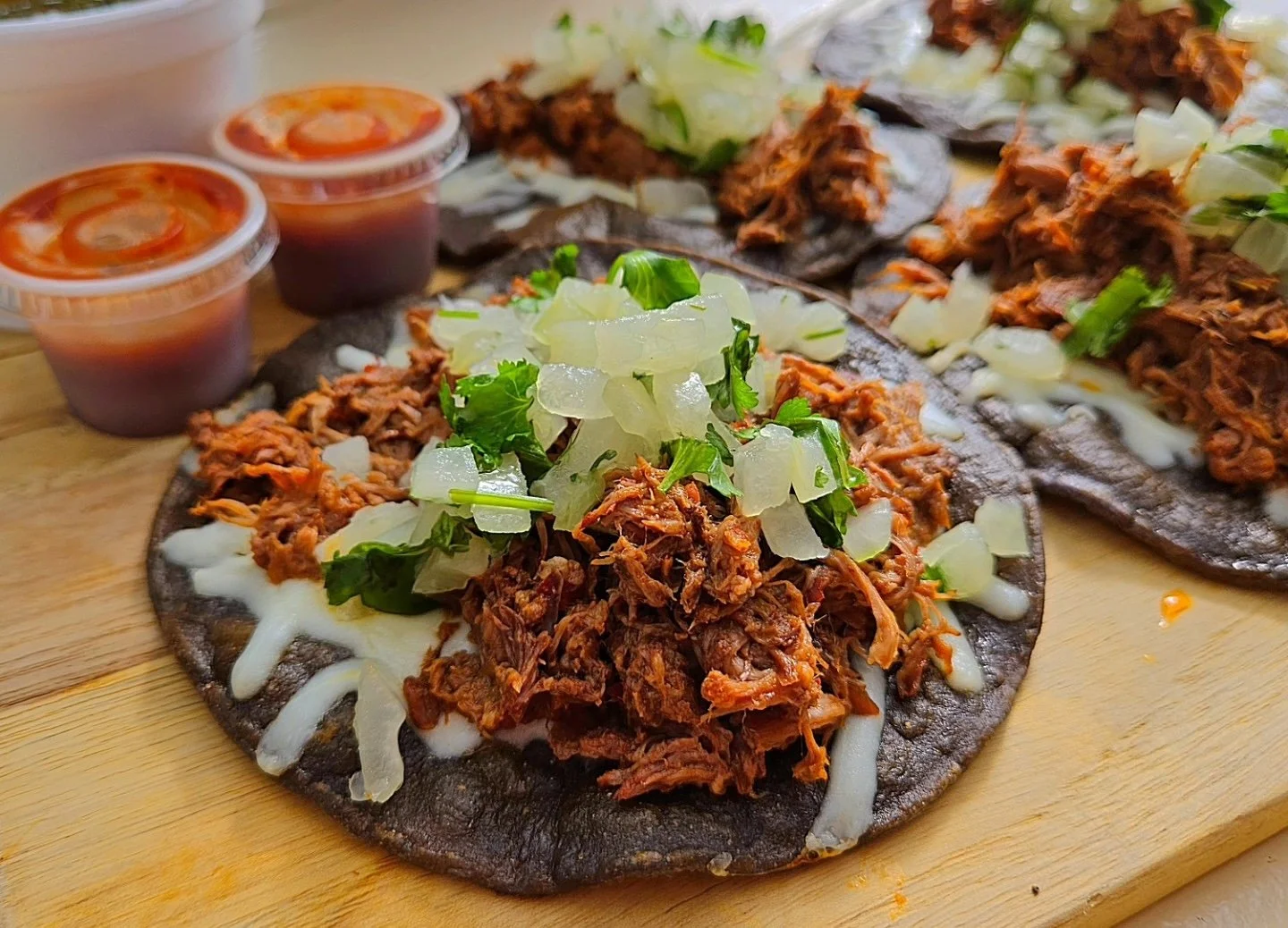 The tacos are made with slow-cooked beef and melted white cheese, served alongside a rich consommé for dipping.