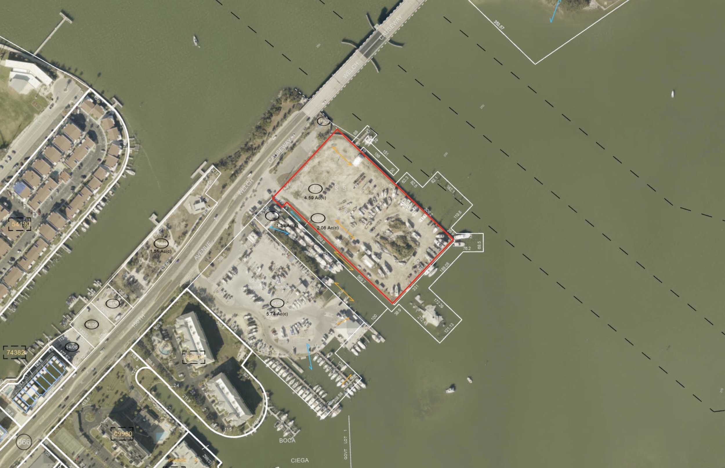 The site is designated C-4 Marina Coastal zoning, which prioritizes marine-oriented uses while allowing a range of complementary commercial uses, including boat storage and repair, retail, hotel, and residential units above commercial space.