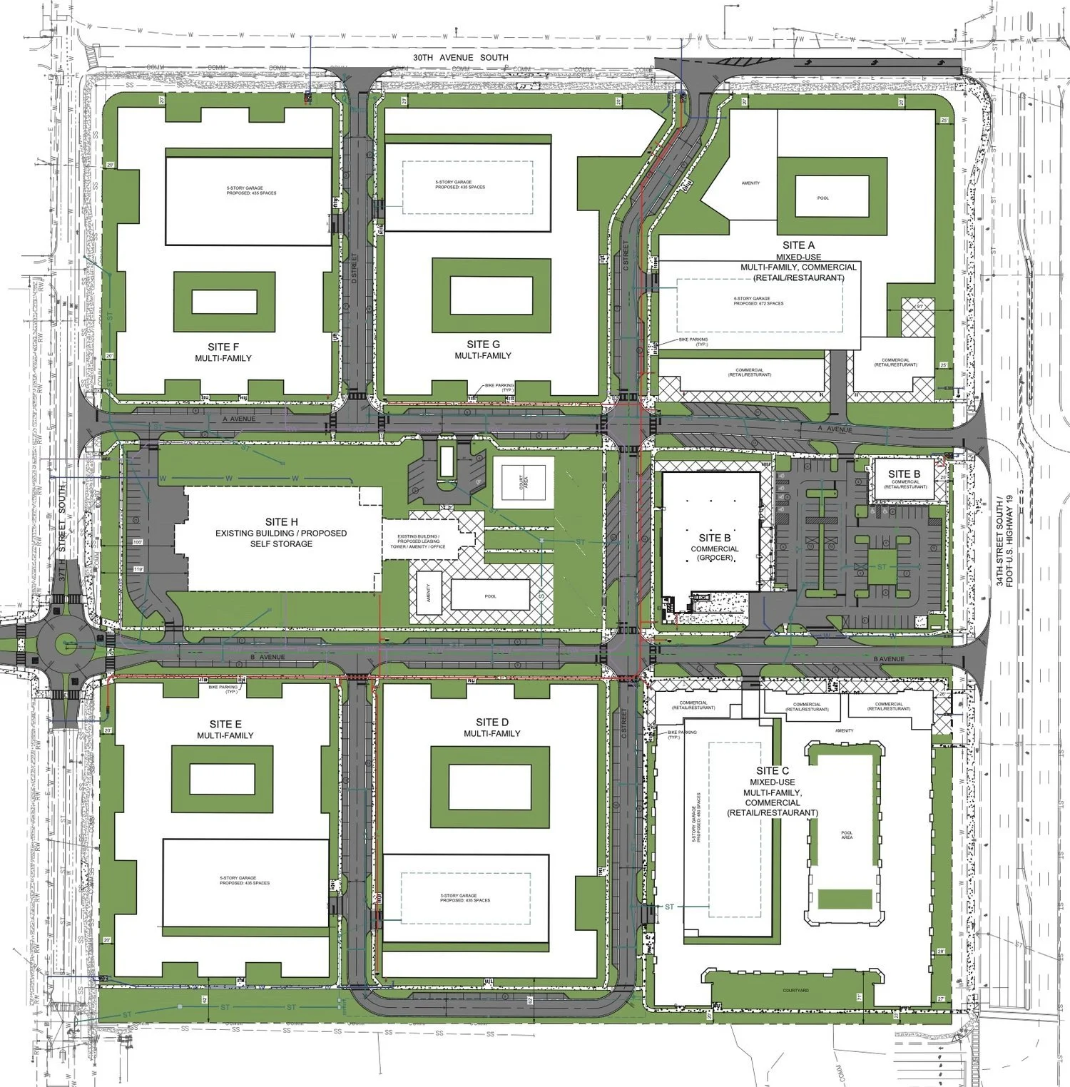 Site Plan for Sky Town, a 34.2-acre $500 million mixed-use project that will bring 2,084 apartments, a Sprouts Farmer’s Market, a self storage facility, and more to the Skyway Marina District of st. Petersburg | Altis Cardinal