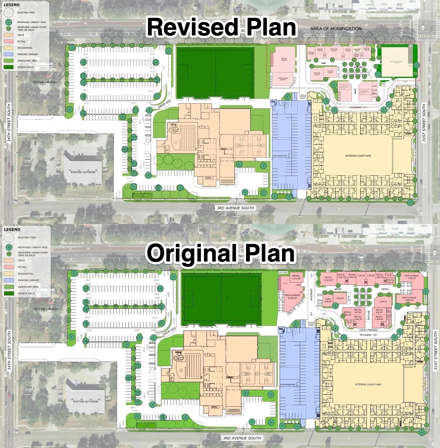 The original plan included 32,000 square feet of retail, while the revised plan contains 24,000 square feet.
