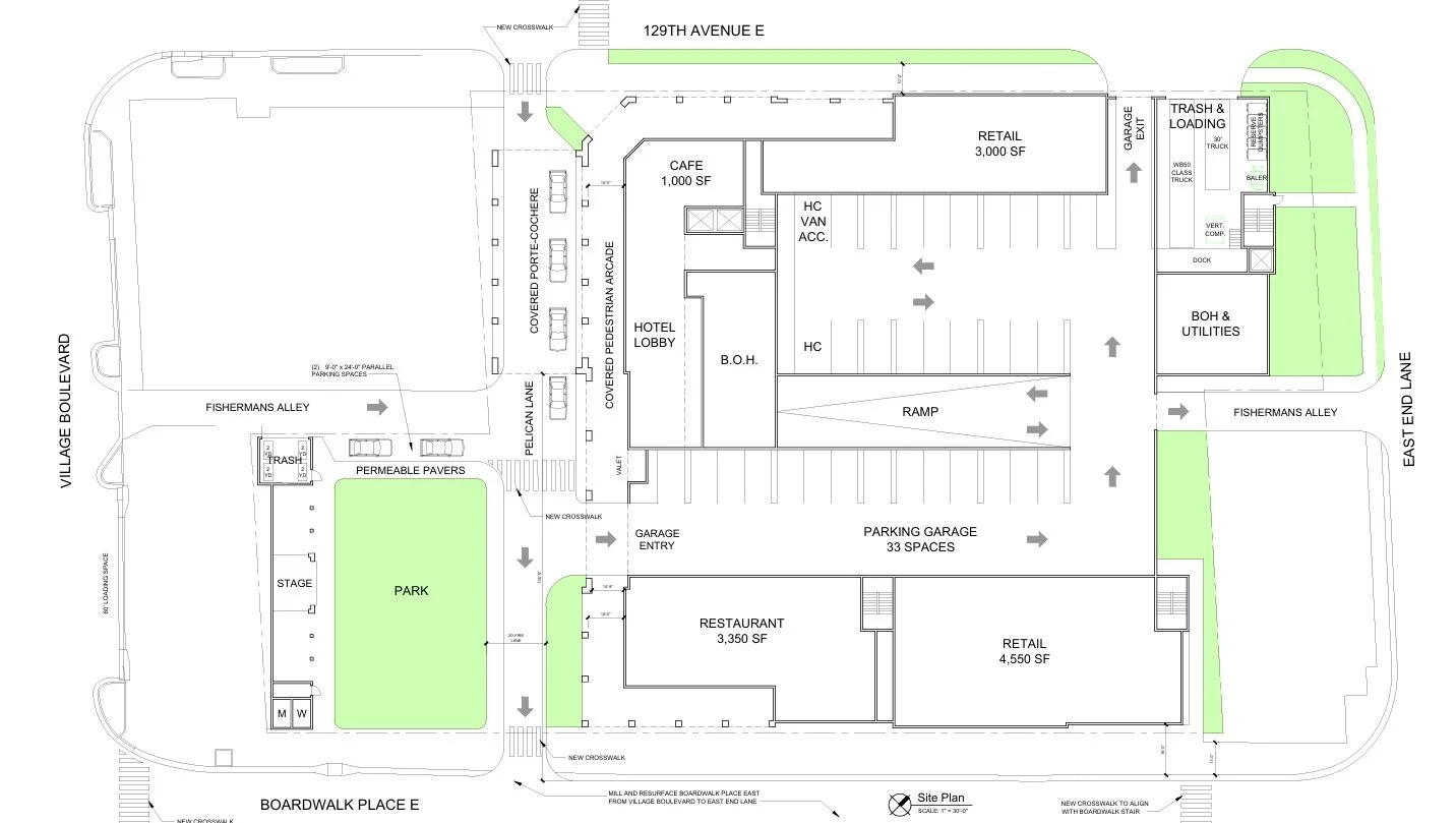Pelican Lane would remain privately owned but include a public easement. Fisherman’s Alley would stay open at both ends to serve existing businesses behind Walt’z Fish Shack.
