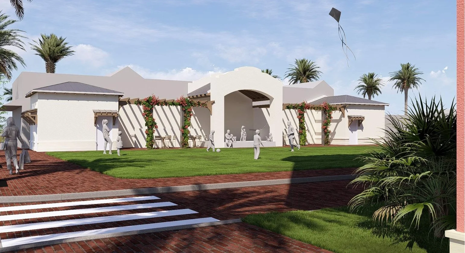 The initial concept called for a white, modern building with columns. The revised plan has a more traditional “fishing village” aesthetic, featuring colorful exterior paint and paneling similar to the storefronts and restaurants along the John’s Pass boardwalk.