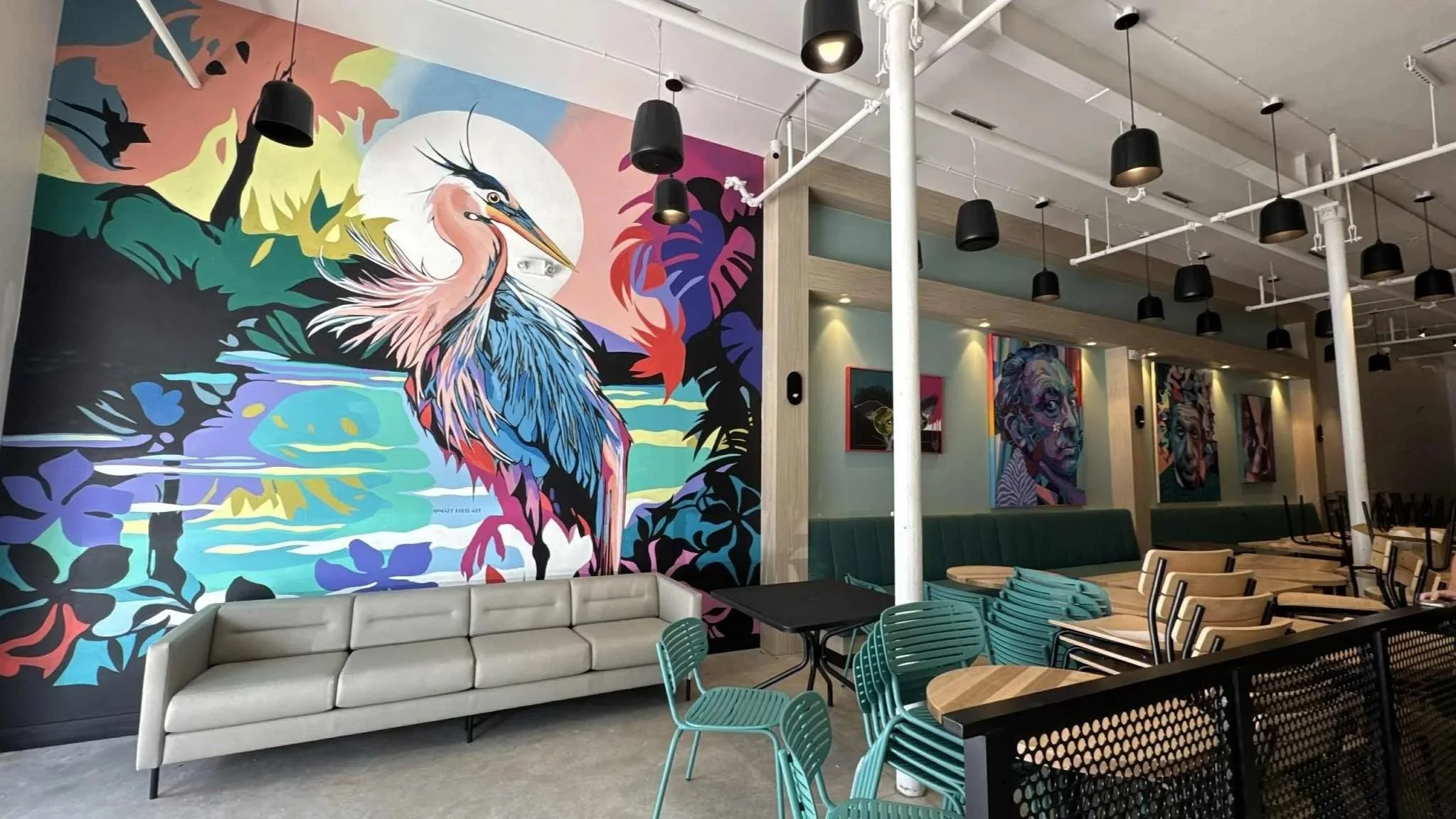 The new 2,430-square-foot location features a clean white aesthetic accented by colorful, Florida-inspired murals painted by local artist Matt Kress.
