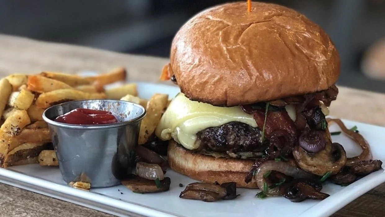 A Southern Grounds house burger made with grass-fed beef, gruyere, bacon, onions, herbs, and mushrooms on buttered brioche | southern grounds