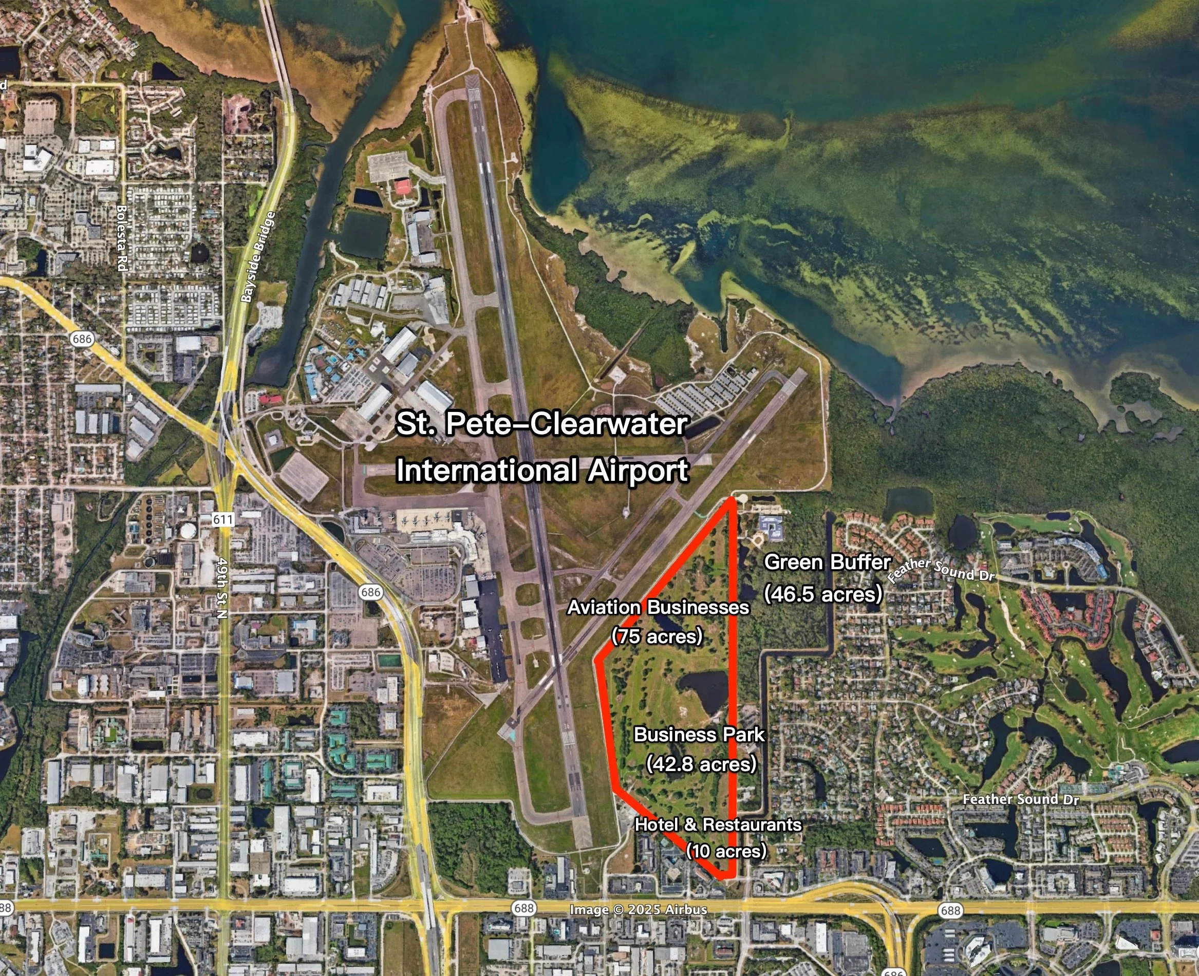 The site will be split into a 117.8-acre business park with 75 acres are zoned for aviation-related uses and 42.8 acres are designated for non-aviation businesses. The southernmost 10 acres of the site, located closest to Ulmerton Road, will allow for commercial uses such as restaurants and hotels, creating a new revenue source for the airport.